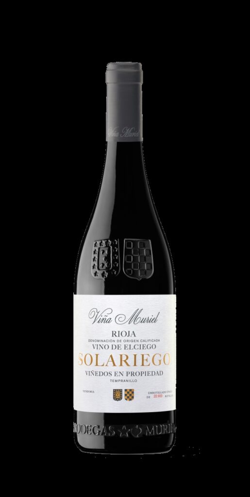 Esta etiqueta destaca por una combinación clásica e infalible en los acabados: la estampación oro sobre la marca Solariego y los escudos y el relieve en estos mismos elementos además de en las leyendas Viña Muriel y Rioja.